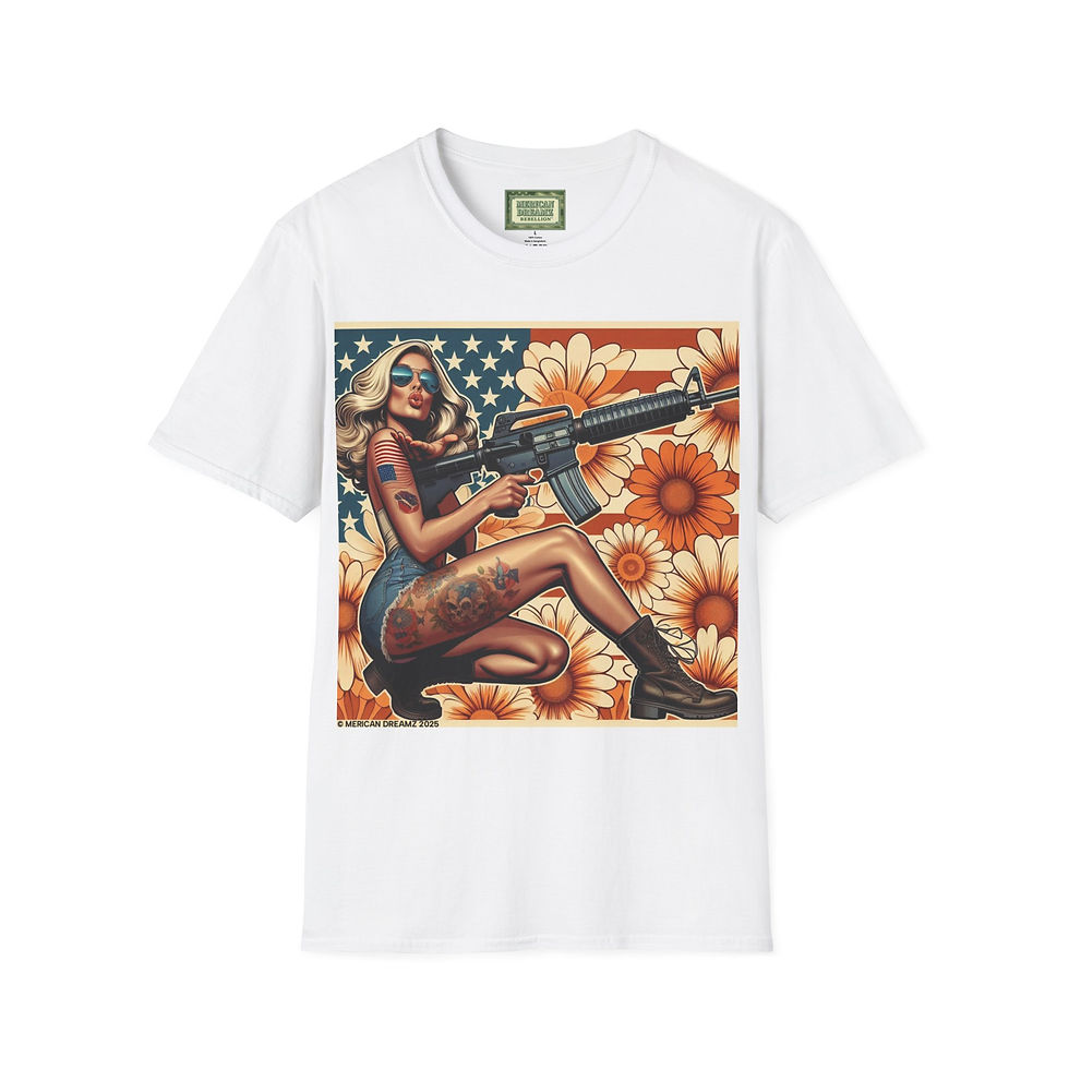 MERICAN DREAMZ REBELLION Pin‑Up Girl T‑Shirt AR‑15 - Retro Americana Graphic Tee